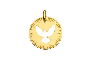 Médaille colombe ajourée en or jaune, symbole de paix et de liberté, une idée de cadeau de baptême ou de communion originale signé AUGIS, la marque centenaire aux mille médailles de baptême.