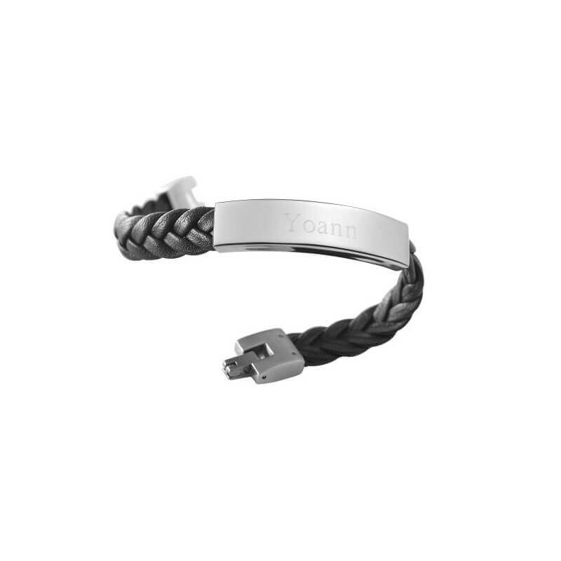 La plaque est également en acier inoxydable. Elle mesure 4,5 x 1 cm et elle est personnalisable par la gravure d’un prénom ou d’un texte, dans la limite de 15 caractères. Vous pouvez choisir votre typographie parmi 5 proposées, les plus adéquates pour un style masculin étant Futura et Classique.