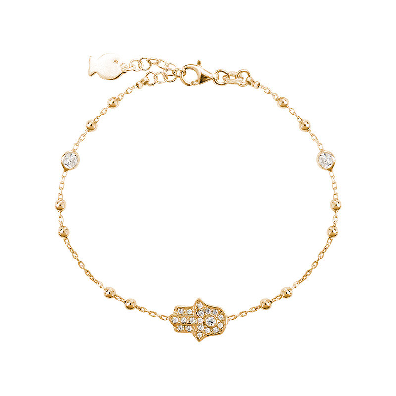 Bracelet doré pour femme ou adolescente Clio Blue, orné d’une Main de Fatma sertie de zirconiums, de petites boules dorées et de brillants zirconiums. Un modèle raffiné en édition limitée, parfait pour un cadeau de Noël ou d’anniversaire.