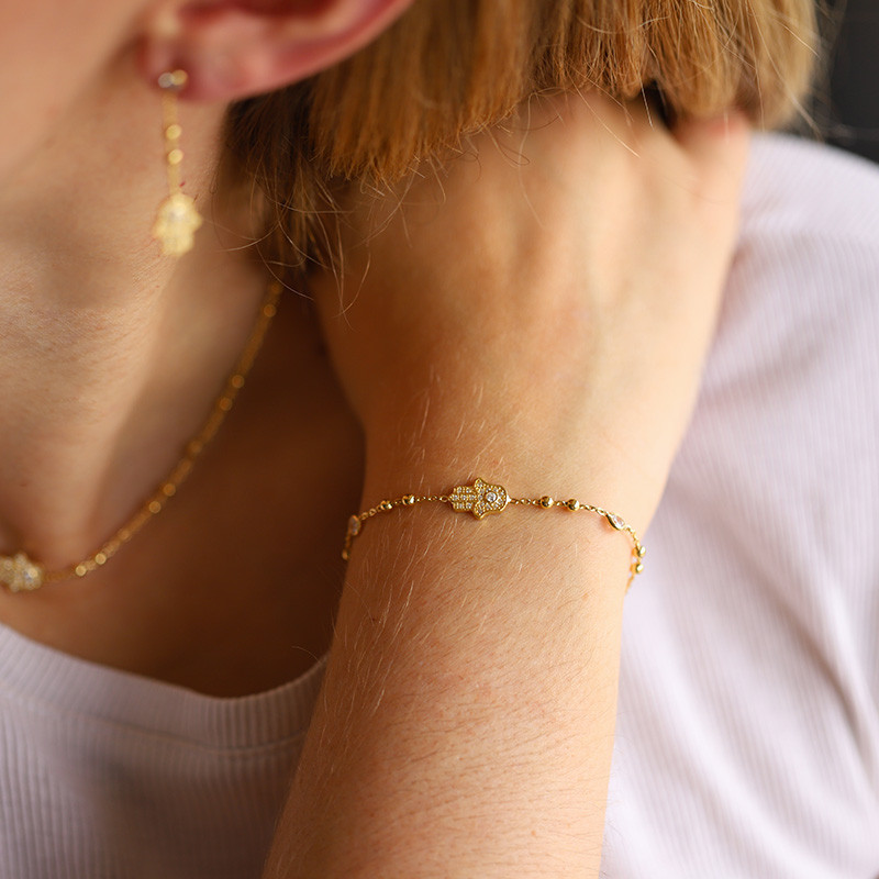 La Main de Fatma, symbole de protection et de chance, se pare de zirconiums étincelants sur ce bracelet doré délicat. Les petites boules dorées et les brillants zirconiums ajoutent un éclat subtil pour un bijou à la fois raffiné et moderne. Idéal pour compléter une tenue festive ou pour offrir un cadeau précieux et significatif.