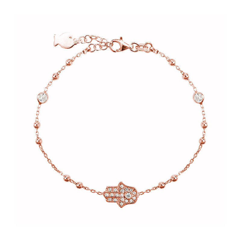 Bracelet rosé délicat pour femme ou adolescente, orné d’une Main de Fatma sertie de zirconiums, de petites boules rosées et de brillants zirconiums. Une édition limitée raffinée, parfaite pour offrir à Noël ou pour un anniversaire.