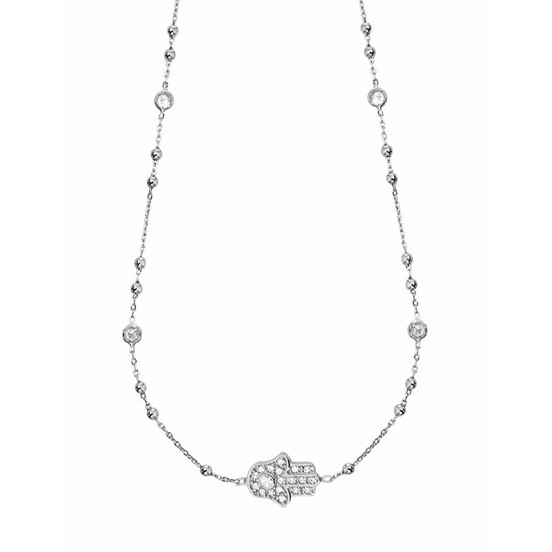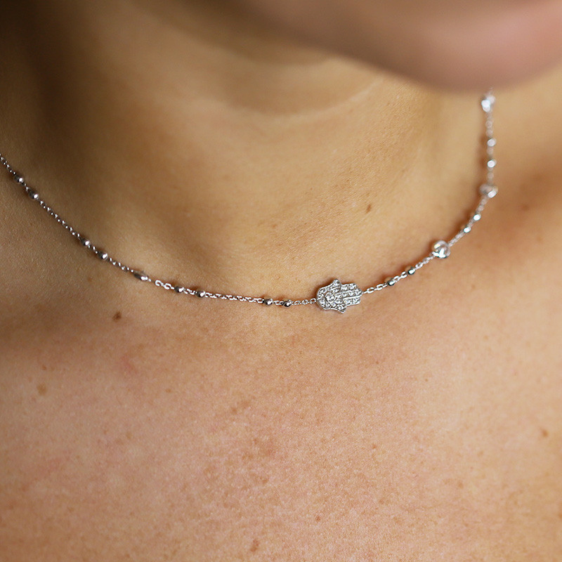 La Main de Fatma argentée symbolise protection et élégance. Les zirconiums brillants et les petites boules argentées apportent lumière et finesse à ce bijou exclusif. Avec son poids moyen de 4,00 gr, ce collier reste léger pour un confort optimal.