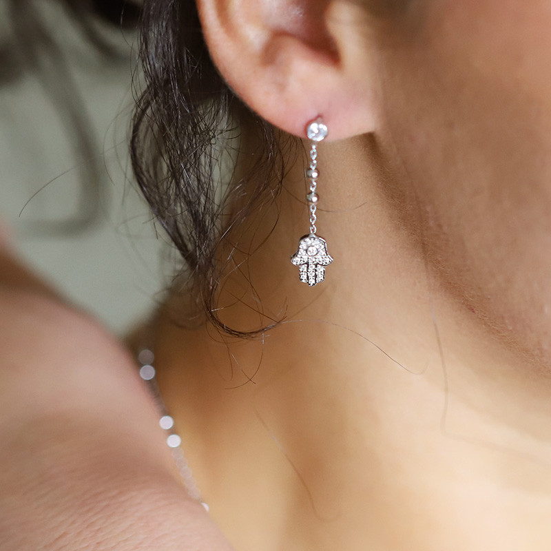 Boucles d’oreilles Main de Fatma argentées pour femme et ado, en argent 925, serties de zirconiums et boules argentées. Bijou protecteur et lumineux, idéal à offrir pour Noël ou anniversaire.