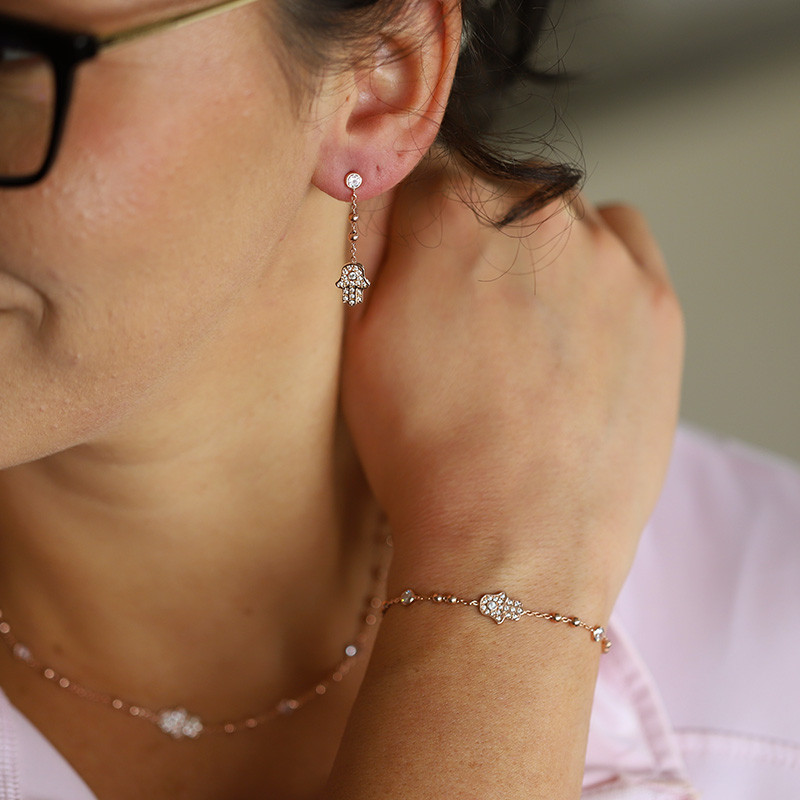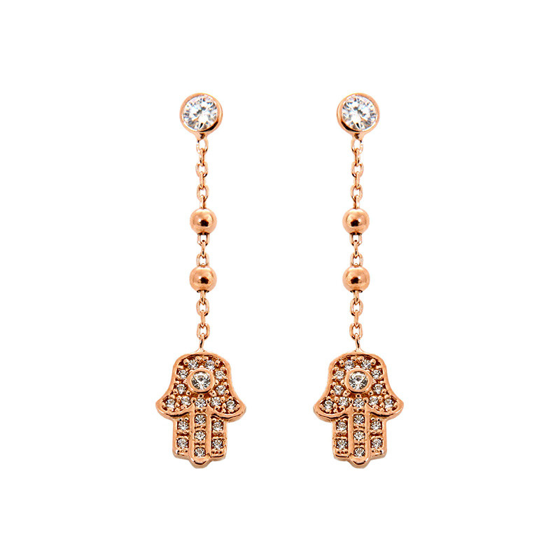 Boucles d’oreilles Main de Fatma rose pour femme et ado, en argent rose, serties de zirconiums et boules assorties. Un bijou délicat et protecteur, idéal pour un cadeau de Noël ou anniversaire.