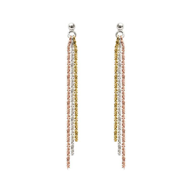 Boucles d’oreilles longues en argent Clio Blue ornées de paillettes argentées, dorées et roses. Une création lumineuse et festive pour sublimer vos tenues de fête ou offrir un cadeau unique à Noël.
