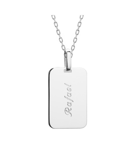 Pendentif garçon argent en forme de plaque militaire, à personnaliser. Signé Petits Trésors, ce modèle est une idée de cadeau original pour un garçon, quel que soit son âge.