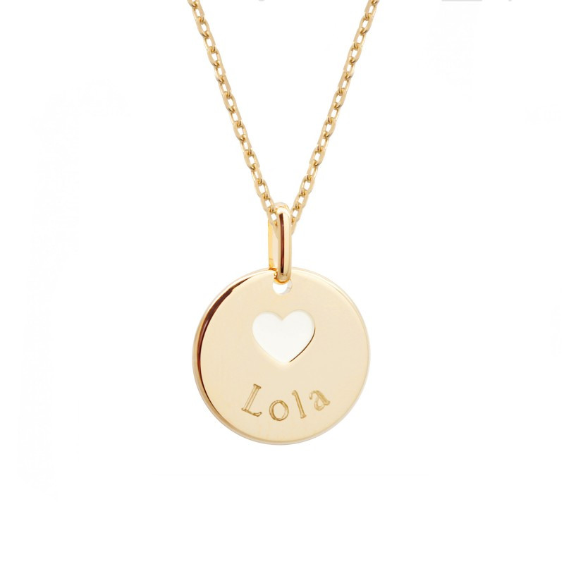 Ravissant pendentif plaqué or et sa médaille ronde à personnaliser, rehaussée d'un petit coeur en nacre blanche. Un bijou pour enfant personnalisable, chic et raffiné.