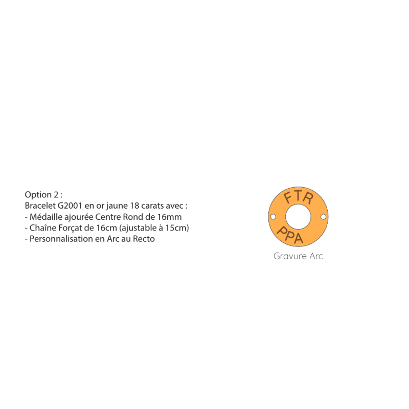 Option 2 : Bracelet G2001 en or jaune 18 carats avec une Médaille ajourée Centre Rond de 16mm, une Chaîne Forçat de 16cm (ajustable à 15cm) et une Personnalisation en Arc au Recto. Cette option est à 530€. 429€ sont réglés. Il reste une différence de 101€.