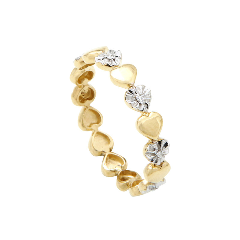 Bague en or jaune et diamants, motif petits cœurs. Un bijou lumineux et délicat, symbole d’amour éternel, à offrir pour Noël ou un anniversaire.