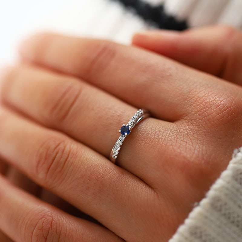 Bague solitaire en or blanc 9K avec saphir central et oxydes de zirconium, un modèle raffiné pour offrir un cadeau unique à Noël ou un anniversaire.