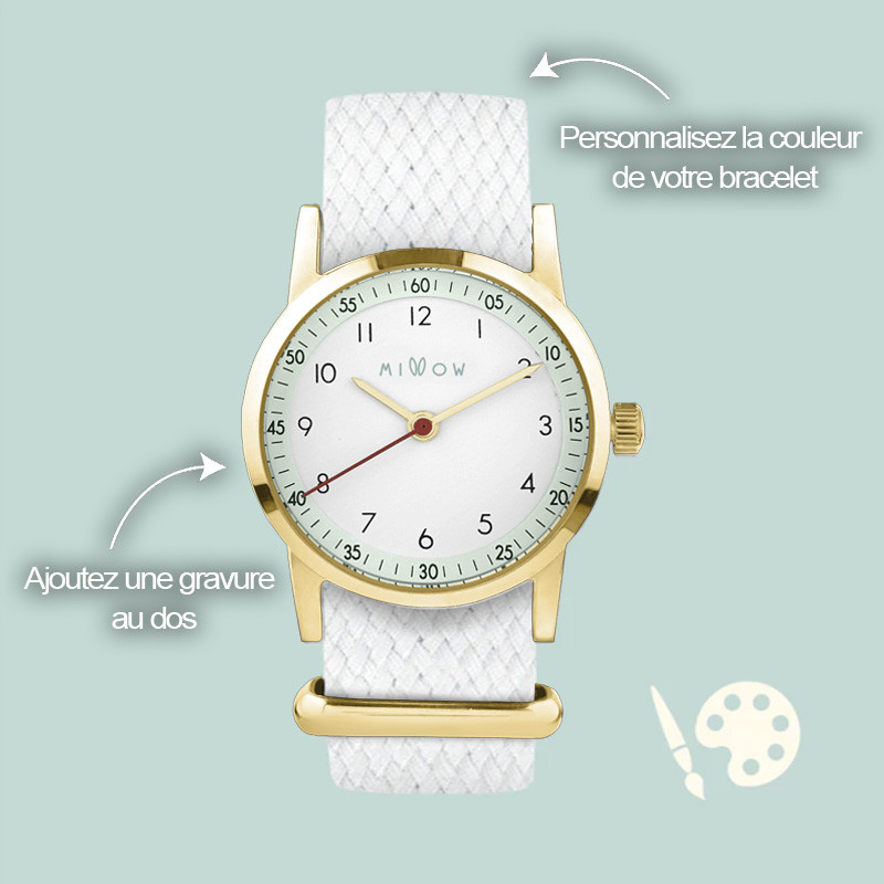 La montre Millow est un modèle de montre pour enfant dès 10 ans, qui allie apprentissage de l’heure et accessoire tendance. Vous pouvez la personnaliser en choisissant la couleur de votre bracelet à associer à un beau cadran argenté du style classique de la marque. Adoptez la immédiatement en ajoutant la gravure de votre choix au dos !