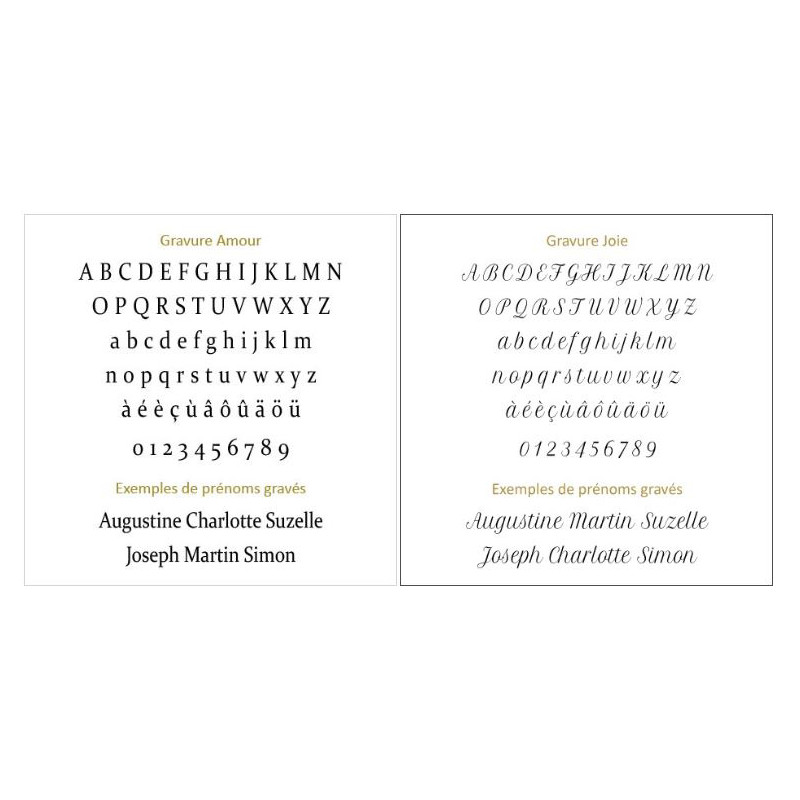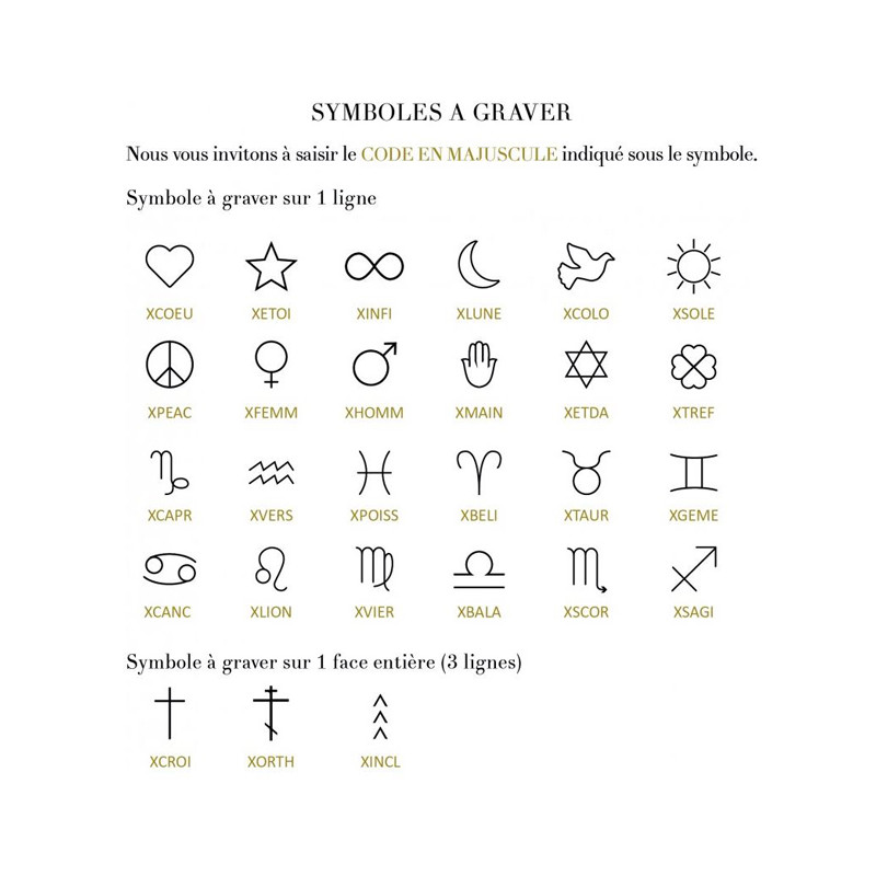 Vous pouvez, en plus, insérer la gravure d’un symbole (voir les symboles proposés dans le carrousel d'images), dans ce cas, notez sur la ligne à graver le code correspondant au symbole choisi. Attention : si vous souhaitez faire graver une CROIX, rien ne pourra être gravé en plus sur le coté où sera gravée la CROIX !